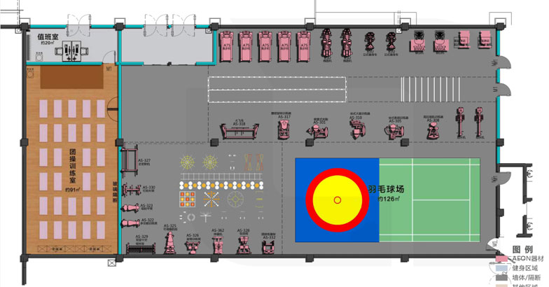 此方案主要由有氧器材和力量器材以及團操訓練室和羽毛球場地組成,適用于大型專業(yè)健身房、專業(yè)健身私教工作室、軍警消防健身房或企事業(yè)單位健身房。